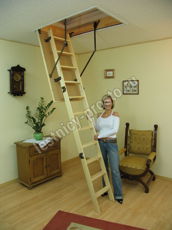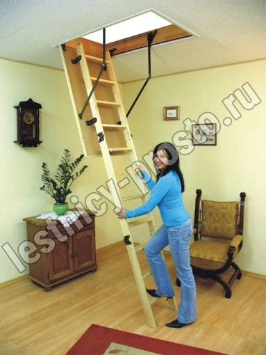 Термоизоляционная крышка типа "сэндвич", толщиной 30 мм, облицована с двух сторон ДCП древесного цвета. Короб люка с уплотнителем. Все металлические элементы лестницы покрашены порошковой краской, ступени лестницы имеют антискользящие насечки и закреплены в столярное соединение «ласточкин хвост», что позволяет выдерживать нагрузку 150 кг. Деревянный стержень для открывания лестницы в комплекте. Две последние секции разобраны. С помощью дополнительной секции высоту лестницы можно увеличить на 55 см.