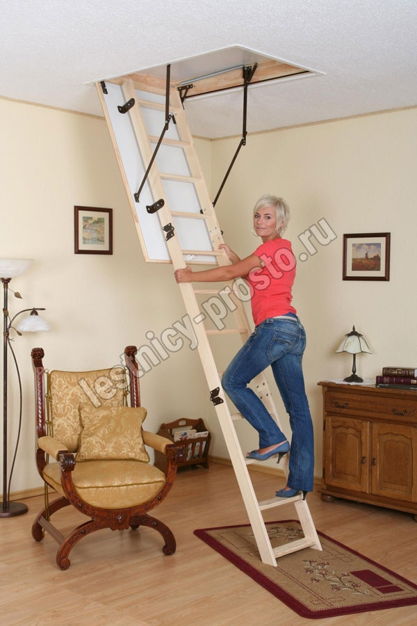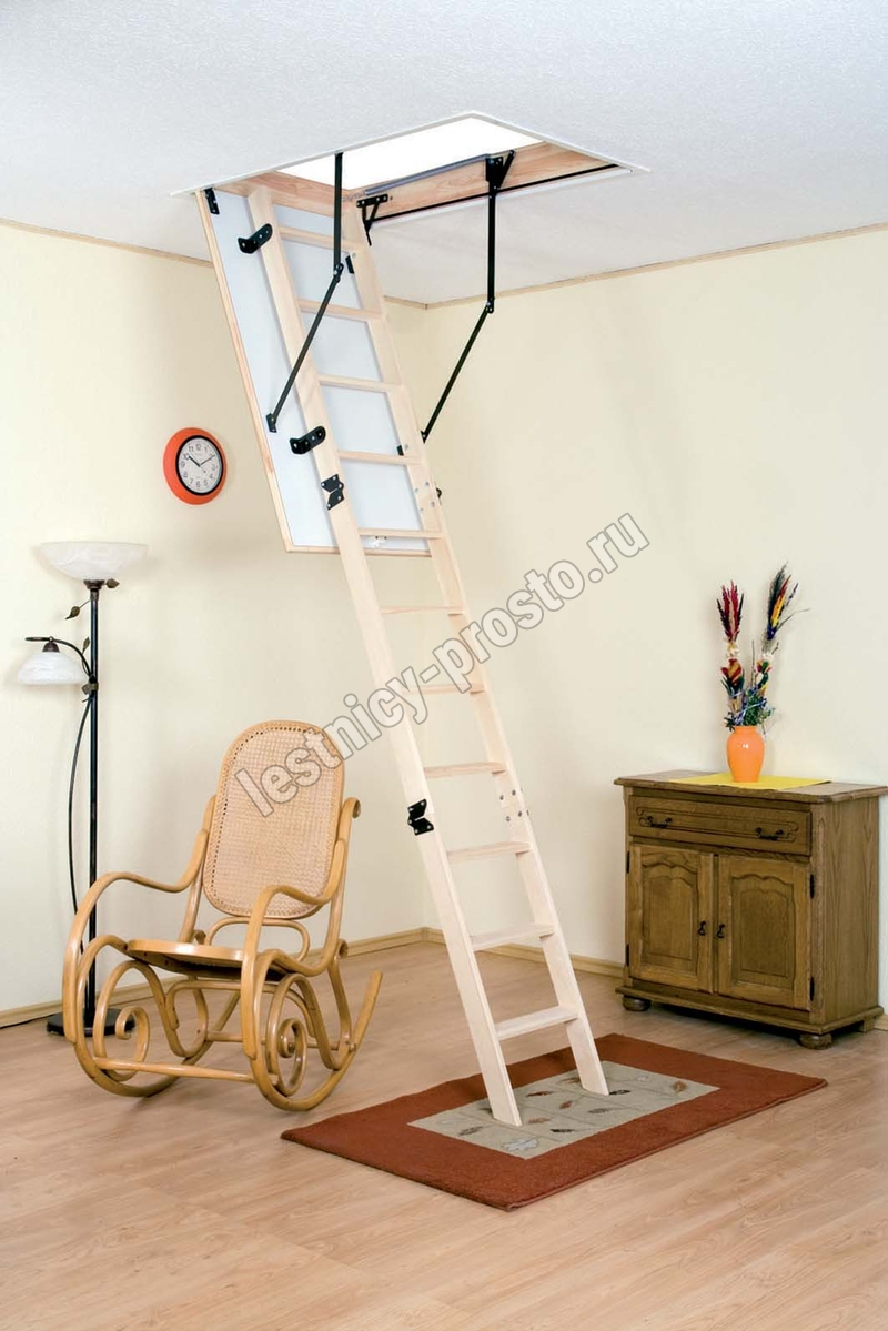 Лестница складная трёхсекционная, изготовлена из сосны. Термоизоляционная крышка типа "сэндвич" утеплена пенопластом, облицована с двух сторон ДСП белого цвета. Короб люка с однослойным уплотнителем. Все металлические элементы лестницы покрыты порошковой краской, ступени лестницы имеют антискользящие насечки и закреплены в столярное соединение «ласточкин хвост», что позволяет выдерживать нагрузку  до 150 кг. Деревянный стержень для открывания лестницы в комплекте.