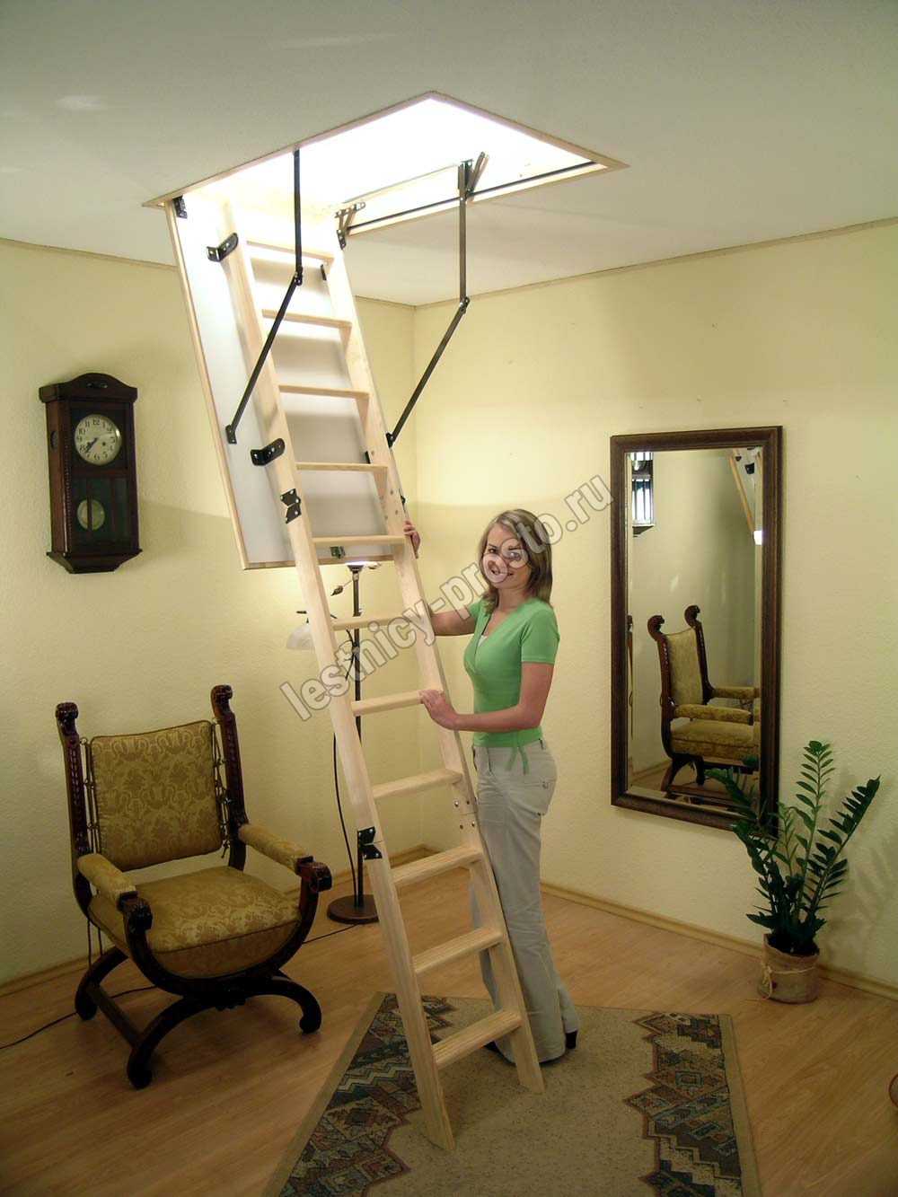 Лестница складная четырехсекционная, изготовлена из сосны. Термоизоляционная крышка типа "сэндвич" утеплена пенопластом, облицована с двух сторон ДСП белого цвета. Короб люка с уплотнителем. Все металлические элементы лестницы покрыты порошковой краской, ступени лестницы имеют антискользящие насечки и закреплены в столярное соединение «ласточкин хвост», что позволяет выдерживать нагрузку 150 кг. Деревянный стержень для открывания лестницы в комплекте.