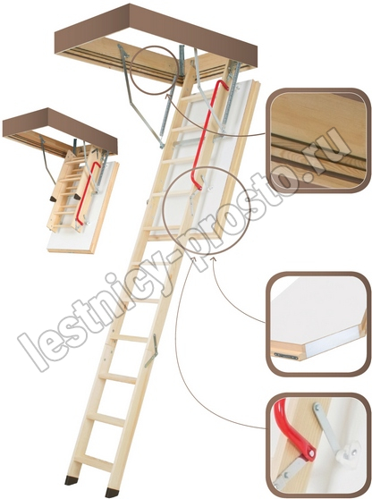 Превосходно подходит для домов, в которых наблюдается значительная разница температур между неотапливаемым холодным чердаком и отапливаемым жилым помещением. В данной модели применена новая конструкция, повышающая прочность и надежность движущихся элементов. Нагрузка при эксплуатации перенесена на лестничный марш, благодаря чему крышка полностью заполнена утеплителем. Лестница LWT комплектуется удобным поручнем и пластиковыми наконечниками на ножки. Монтажный комплект LXK приобретается отдельно.