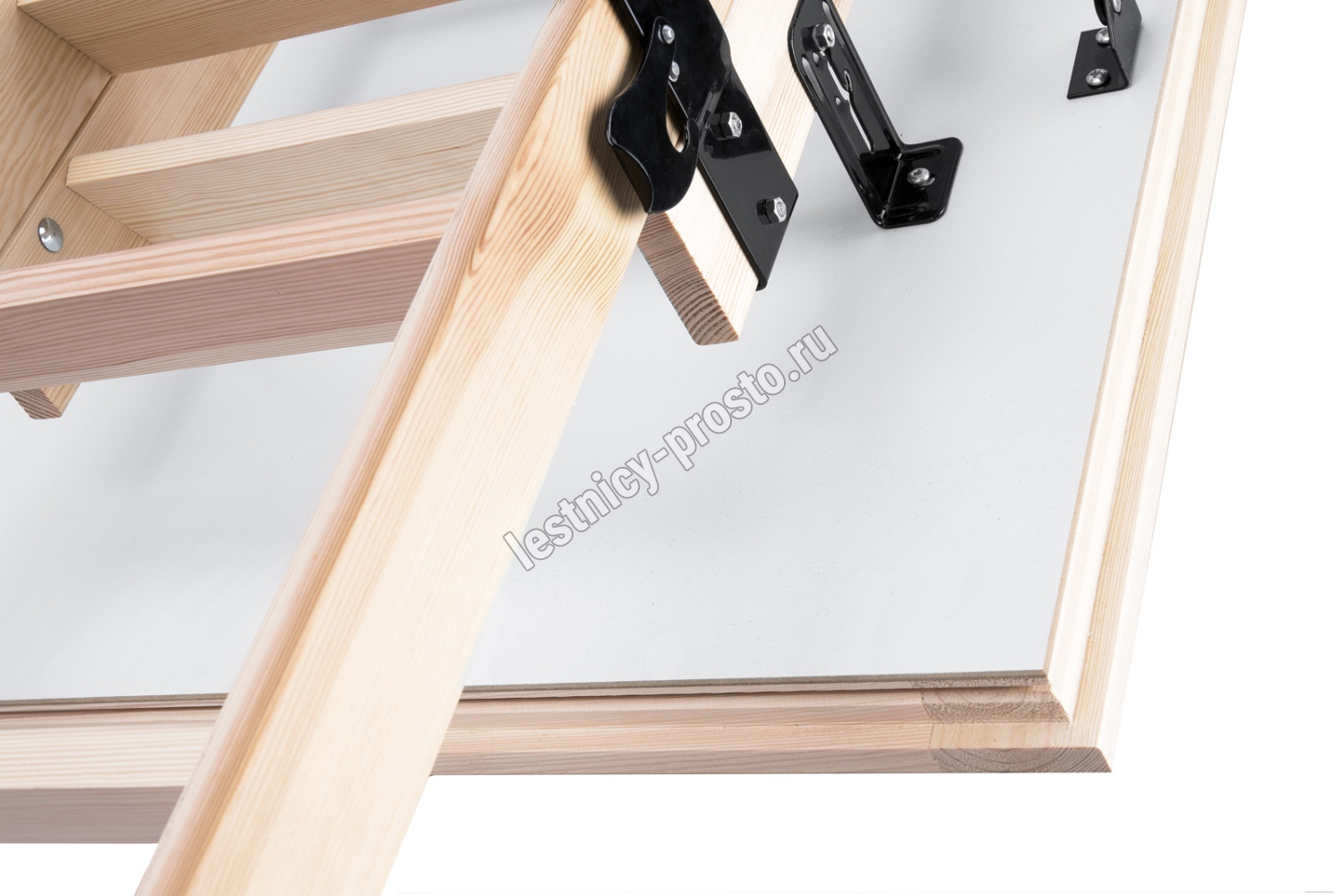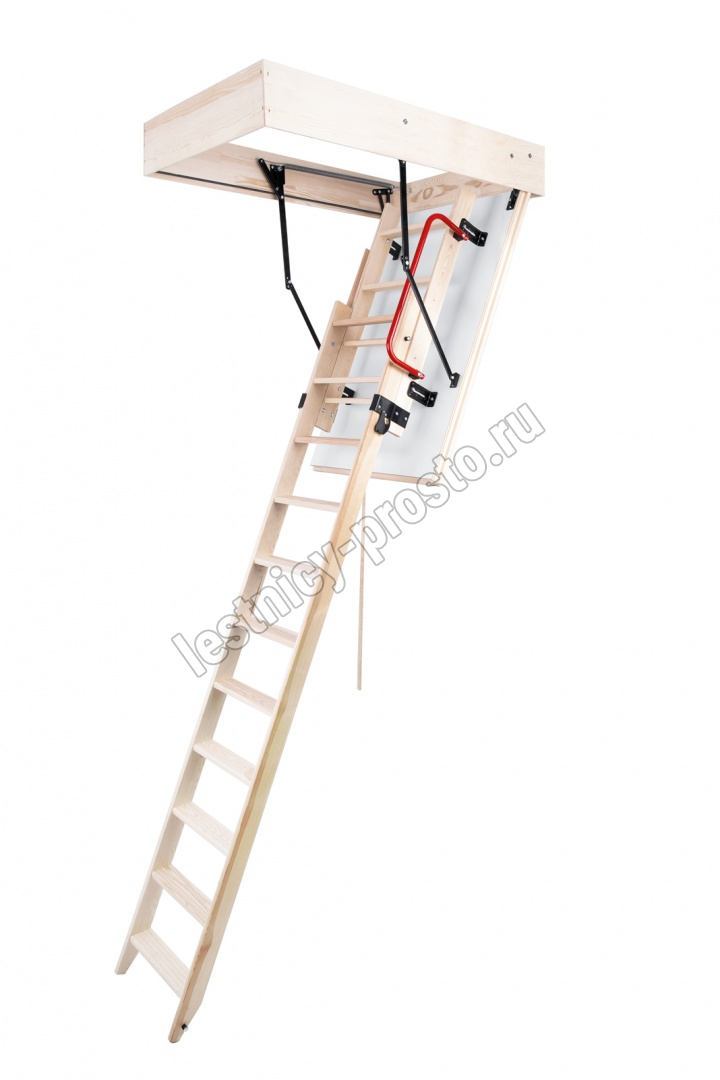 Лестница раздвижная двухсекционная, изготовлена из сосны. Термоизоляционная крышка типа "сэндвич" имеет усиленную теплозащиту, облицована с двух сторон ДСП белого цвета. По контуру короба имеется уплотнитель. Все металлические элементы лестницы покрыты порошковой краской, ступени лестницы имеют антискользящие насечки и закреплены в столярное соединение «ласточкин хвост», что позволяет выдерживать нагрузку 150 кг. При раскладывании лестницы нет вылета за пределы короба, что позволяет использовать эту модель лестницы в таких помещениях, где невозможно использовать чердачные лестницы с большим разбегом открытия. Удобна для эксплуатации на большой высоте. Деревянный стержень для открывания лестницы в комплекте..
