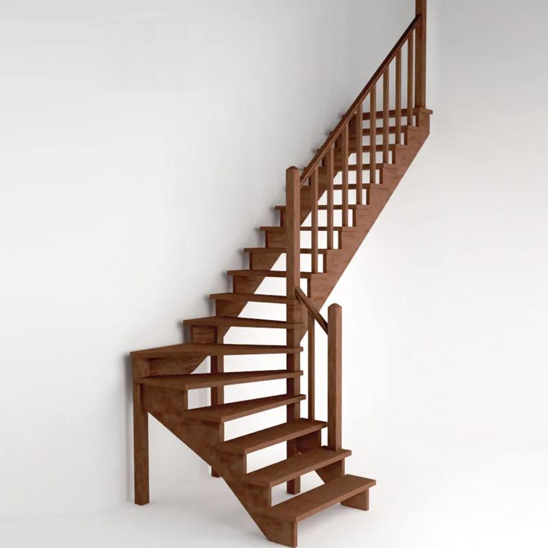 Компактная лестница из дерева. Удобный подъем засчет забежных ступеней и ограждений, которые входят в стандартную комплектацию. В стандартной комплектации столбы квадратные, балясины точёные. Элементы лестницы и ограждения поставляются в разобранном виде без какого-либо покрытия.