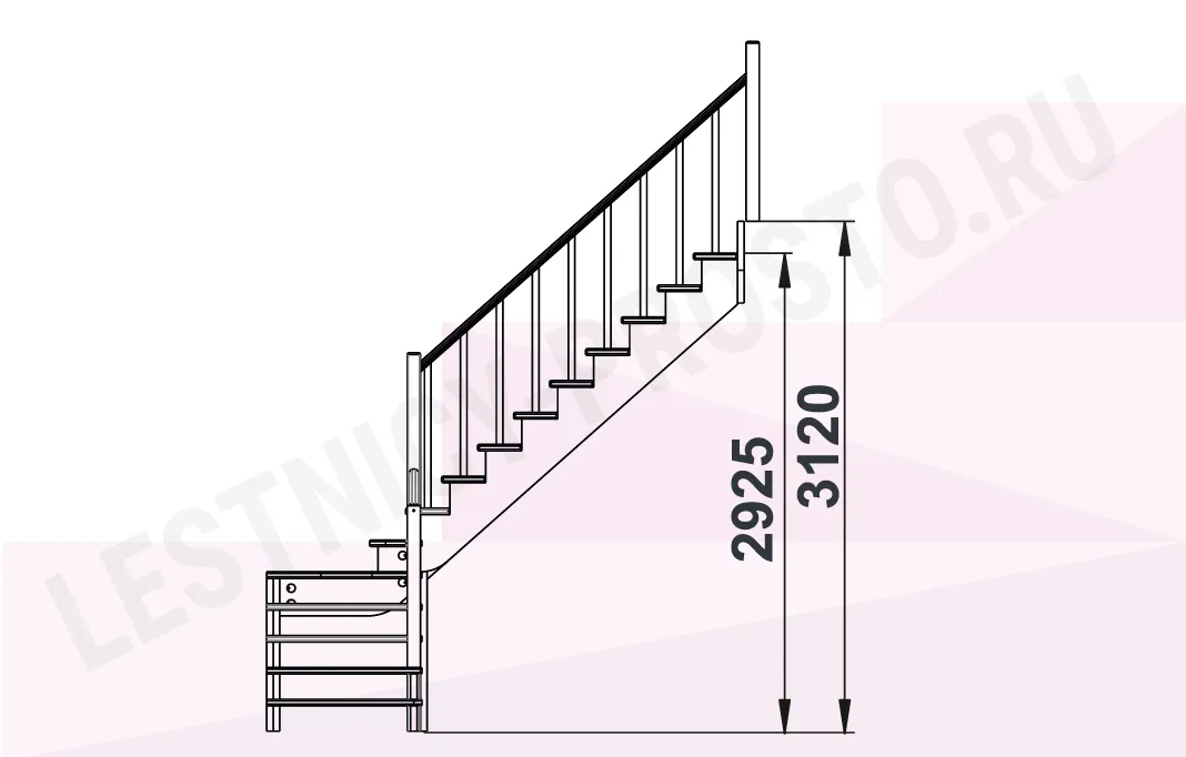 Ступени и поручень лестницы выполнены из бука, остальные элементы из сосны. Возможно изготовление данной модели полностью из бука. Базовый комплект включает в себя деревянные элементы лестницы и ограждения без какого-либо покрытия.