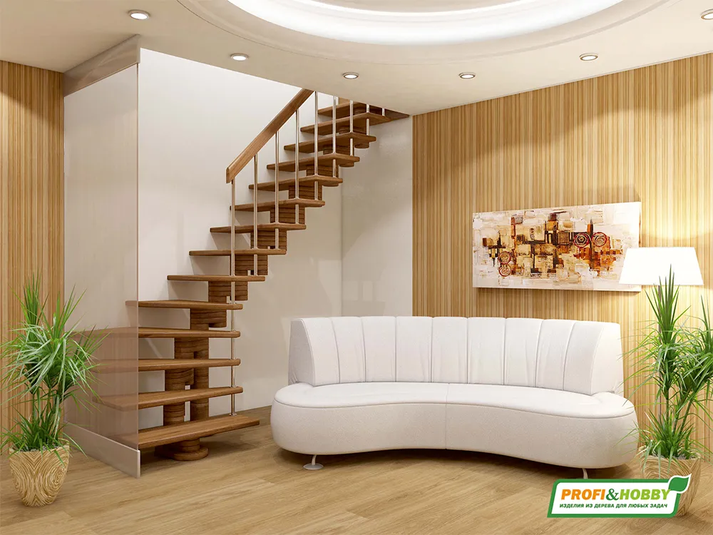 Ступени и поручень лестницы выполнены из ясеня, остальные элементы из сосны.