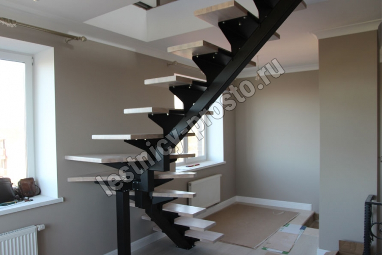 Основой лестницы служит цельносварной центральный косоур, который обеспечивает надёжную прочность конструкции и "парящий" дизайн, лестница с таким каркасом в интерьере смотрится легко и воздушно.