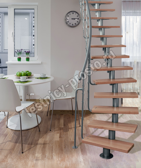 Лестница на стальном модульном каркасе. Высота лестницы регулируется при сборке засчет регулировки высоты шага. Ступени покрыты защитным лаком. Ограждение из стали с пластиковым поручнем. В комплект входят перила с вертикальными стойками и горизонтальными перегородками. Изделие поставляется с шурупами (кроме потолочных и напольных анкеров), инструкциями по монтажу и эксплуатации и гарантией. Внимание! Для этой лестницы необходимо крепление к стене.