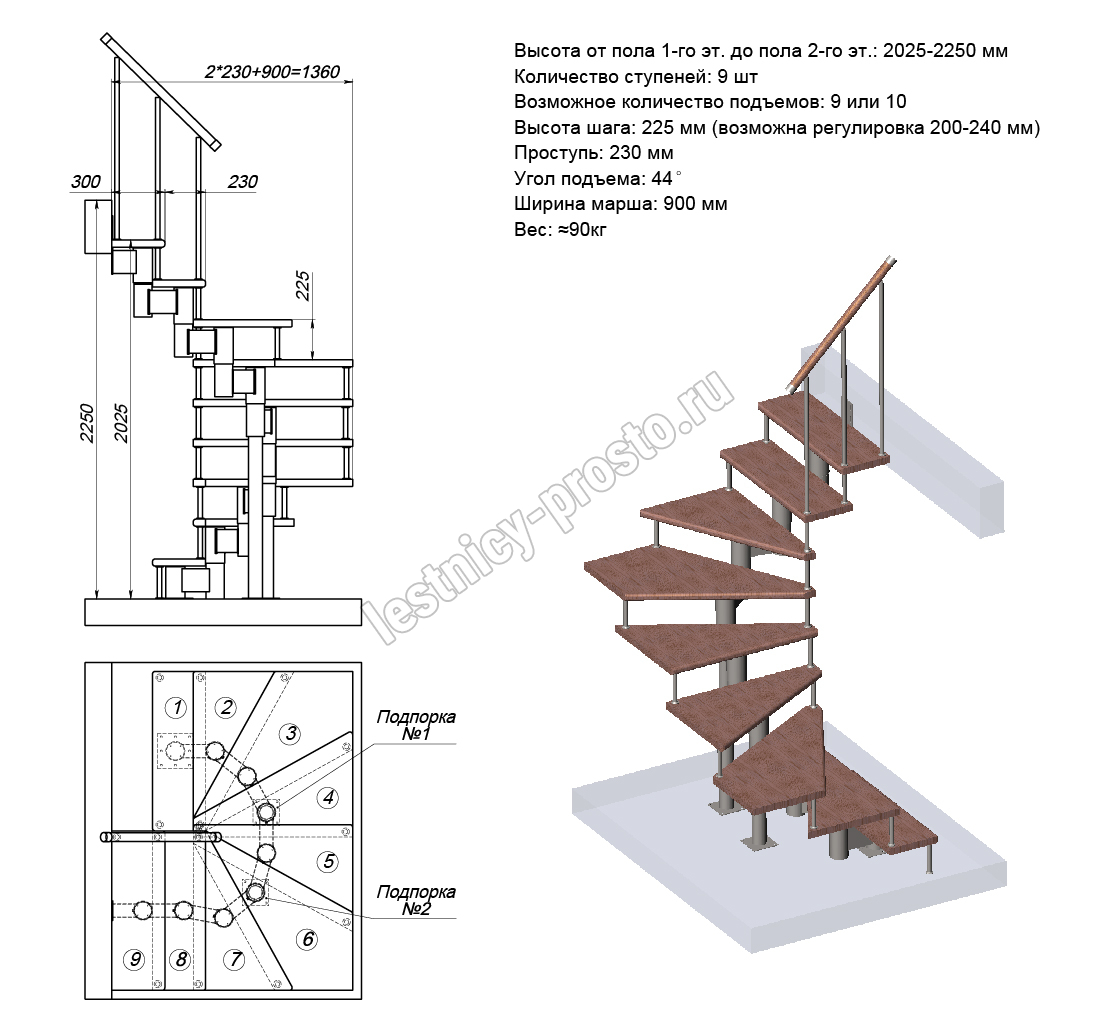Высота лестницы 2025 - 2250 (9 ступеней) мм