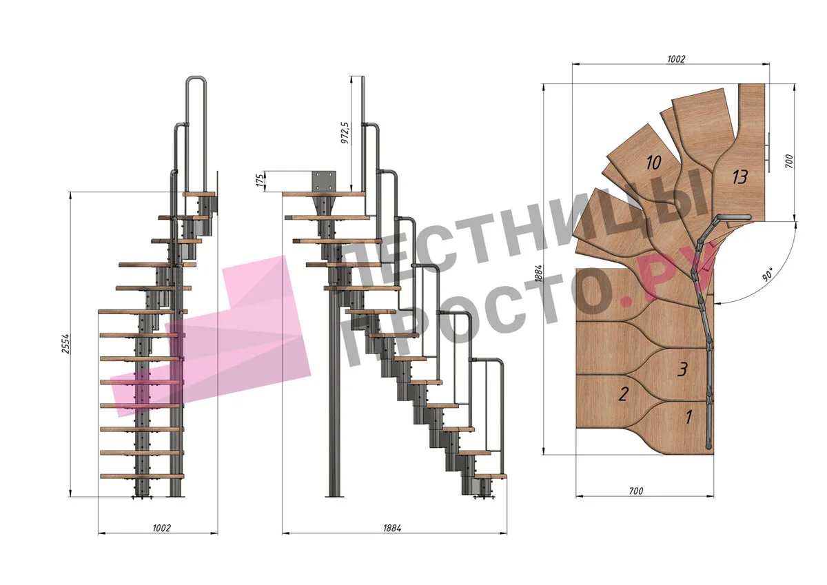 | Лестница Prosto Urban Black гусиный шаг 700 мм, h216-312 см (12 ступеней), бук |
