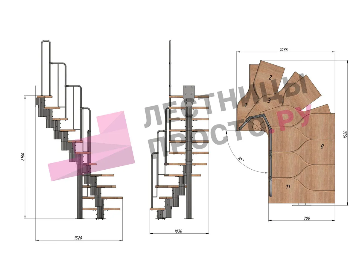 | Лестница Prosto Urban Black гусиный шаг 700 мм, h216-312 см (12 ступеней), ясень |