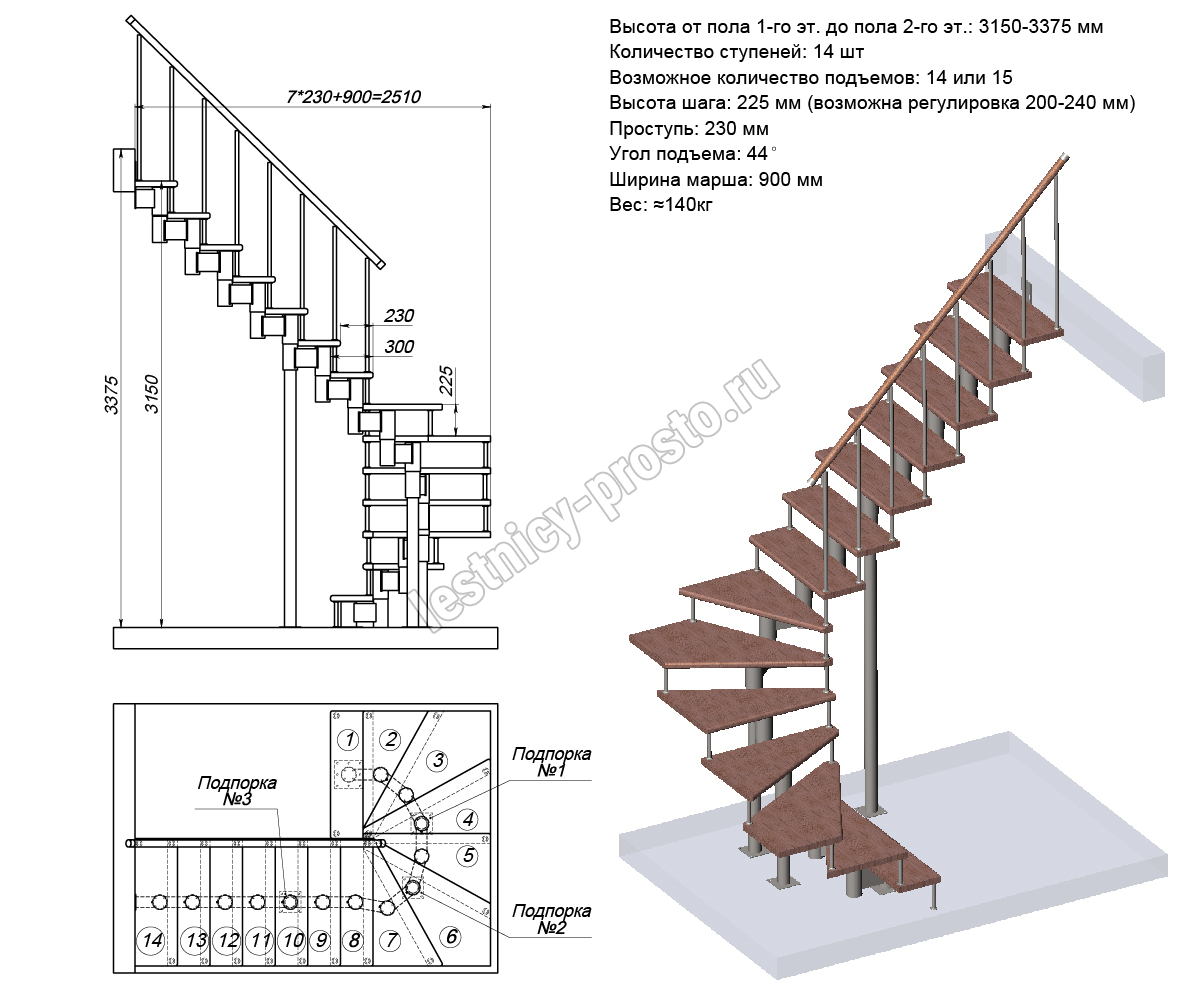 Схема и расчет указаны для шага 225 мм - мы рекомендуем эту высоту шага, как оптимальную для обеспечения комфортного подъёма и экономии бюджета.