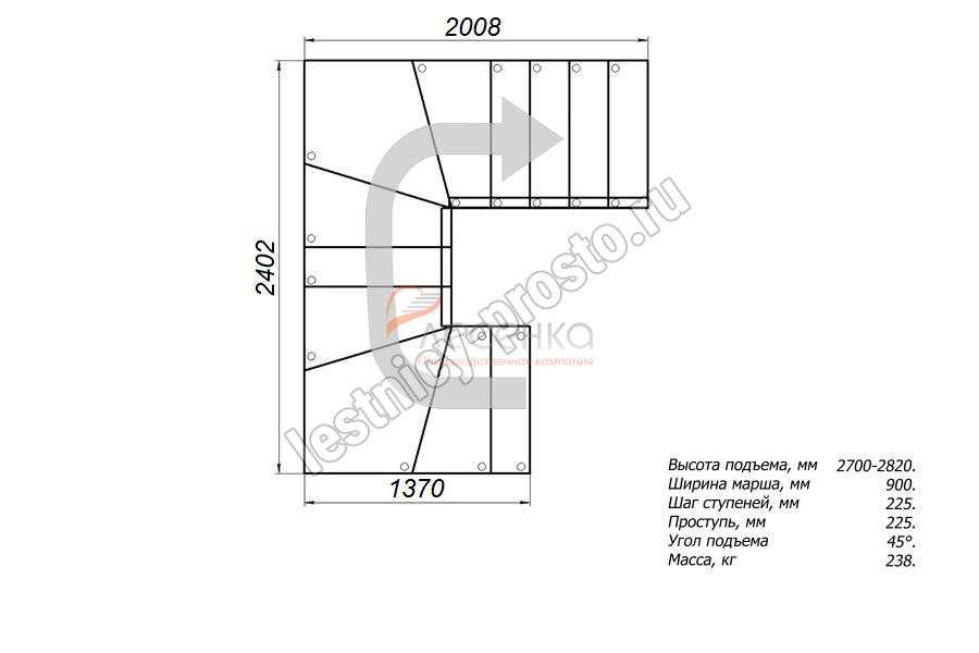 Модульная лестница Спринт 225 2700-2820, Черный, Сосна, Нержавеющая сталь