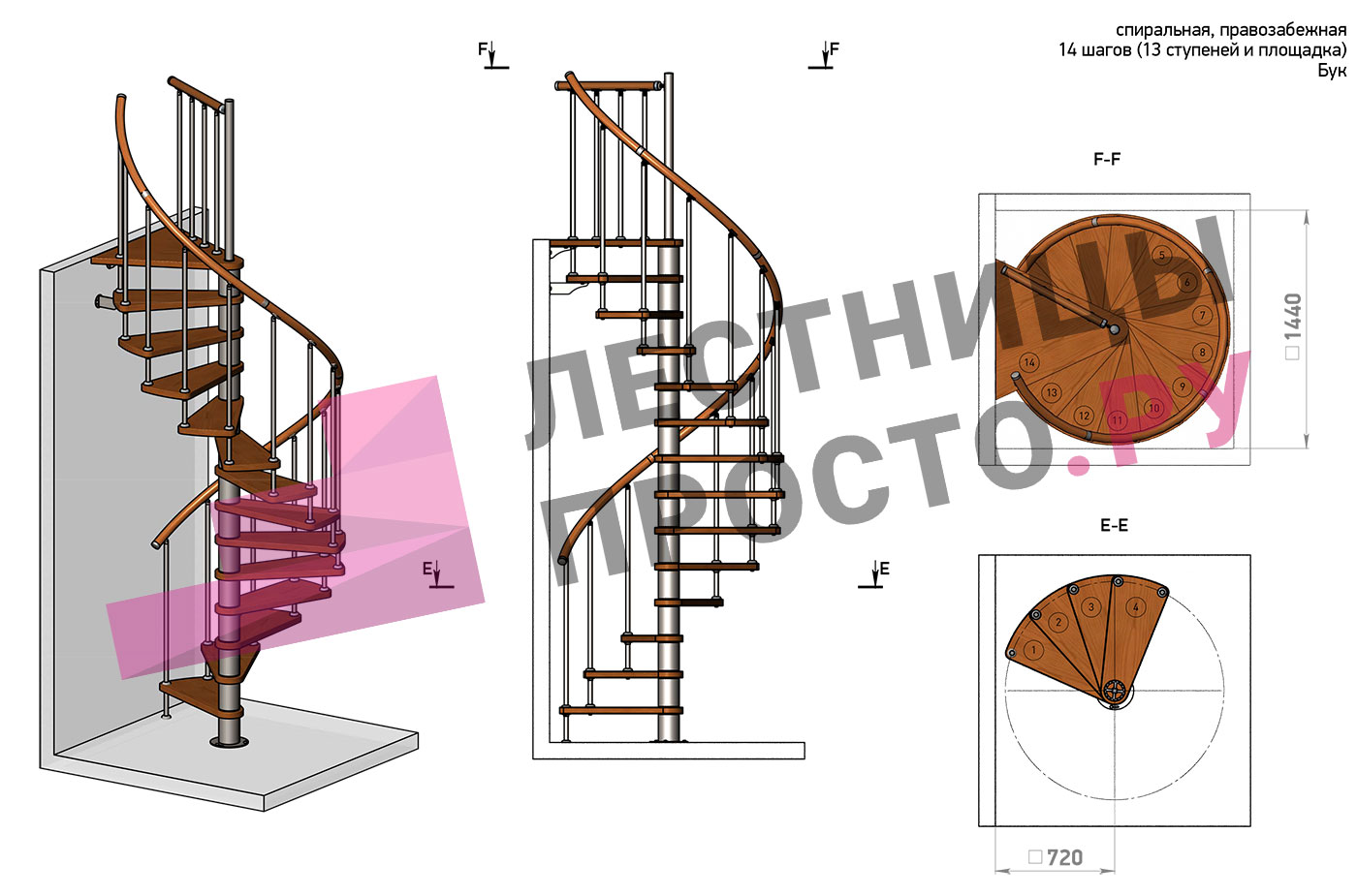 | Винтовая лестница Prosto Spiral Black D140см, h303.9-348,1 см, бук |